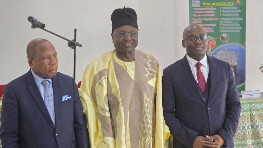 Le nouveau DG/A (au centre) de Hydrac S.A, entouré du DG (gauche) et du Représentant du Président du Conseil d’Administration d’Hydrac S.A (droite)
